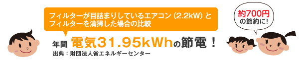フィルターやエアコン内部がホコリや汚れで目詰まりしていると、ちょうどドライヤーの後ろを手で押さえたのと同じように、負担がかかって電気効率がダウンしてしまいます。月に1回か2回かはお掃除をしましょう。