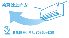 冷たい空気は上から下に流れていきます。冷房中はエアコンの吹き出し口を上向きになるように風向きを調節すると、部屋全体に空気が流れます。扇風機を併用して、床に溜まりがちな冷気を循環させるとより効果的です。