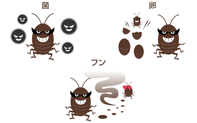 菌に汚染された場所をゴキブリが徘徊することで、ゴキブリに菌が付着し、そのゴキブリが新たな場所に菌を運びます。