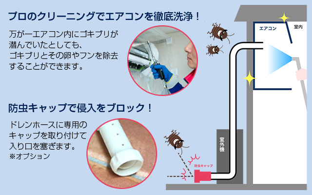 プロの技術でエアコンを洗浄することで、万が一エアコン内にゴキブリが潜んでいたとしても、ゴキブリとその卵やフンを除去することができます。防虫キャップでゴキブリの侵入をブロックしたら、さらに安心です。