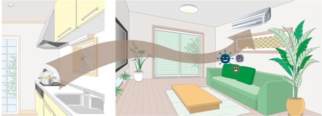 LDKの間取りは、リビング、ダイニング、キッチン全体の空気を調整する力が必要なため、その分昔のタイプよりも、風量・風速・冷却機能などパワーがあります。その分、換気扇が汚れて換気効率が落ちていると、換気扇が吸い込む力より、エアコンの吸い込む力が勝り、料理をするときに発生する蒸気となった油汚れをエアコンが吸い寄せてしまいます。