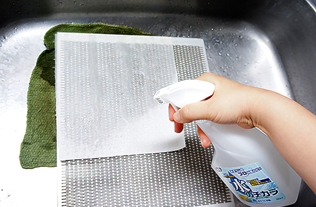 ①フィルターにキッチンペーパーをあて、その上から洗剤をスプレーします。