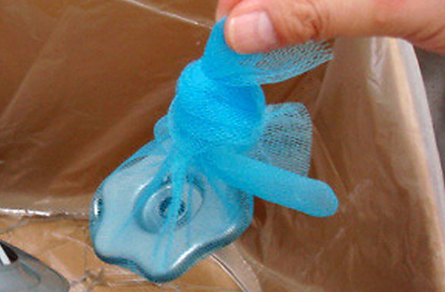 ②細かい部品はゴミ取りネットに入れて口を結んで、他のパーツと一緒につけ置きします。
