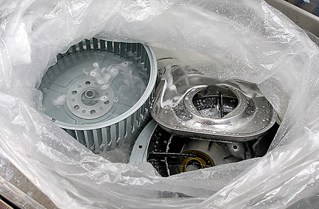③外した部品をゴミ袋に入れ、洗剤をかけてパーツが浸る程度45〜50℃のお湯を注ぎます。浅漬けをするようになるべく空気を抜いてゴミ袋の口を結び、20分ほどつけ置きして油汚れをふやかします。