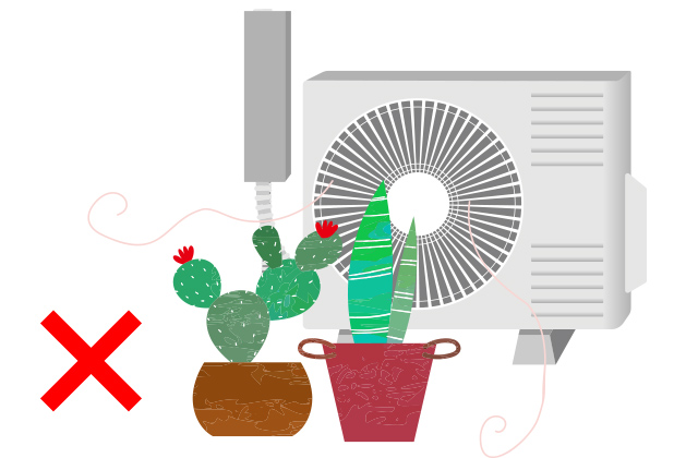 室外機の周りに物がたくさんあると、空気がスムーズに往来できず、エアコンの効きが悪くなってしまう可能性があります。特に吹き出し口や吸い込み口付近には物を置かずに風が良く通るようにしておきましょう。