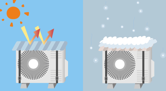 例えば夏場に直射日光が当たってしまうと、冷媒が運んできた熱の放出を妨げてしまう可能性があります。逆に、冬場に雪がかかった場合には、暖かい空気を室内に送りこみにくくしてしまいます。