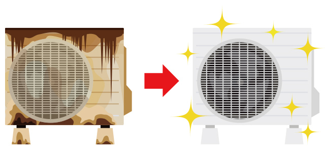 室外機に汚れが溜まってしまうと、室内環境を快適にするための冷却・排熱機能が低下し、エアコンの効きが悪くなる恐れがあります。定期的に掃除を行うことをおすすめします。