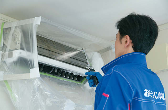 おそうじ本舗のエアコンクリーニングは、専用の洗剤と高圧洗浄機を使い、エアコン内部の汚れをスッキリと洗い流します。