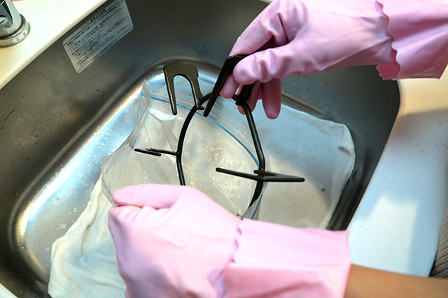 - ⑦洗った五徳を水で洗い流して、タオルで水気を取って乾かす