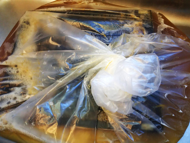 時間が経って酸化が進んだ油汚れも、お湯で一定時間温めると柔らかくなって、取れやすくなります。換気扇フィルターやコンロの五徳のように取り外しができる物は外してしまい、50リットルくらいの大きなゴミ袋に入れてシンク内に置きます。