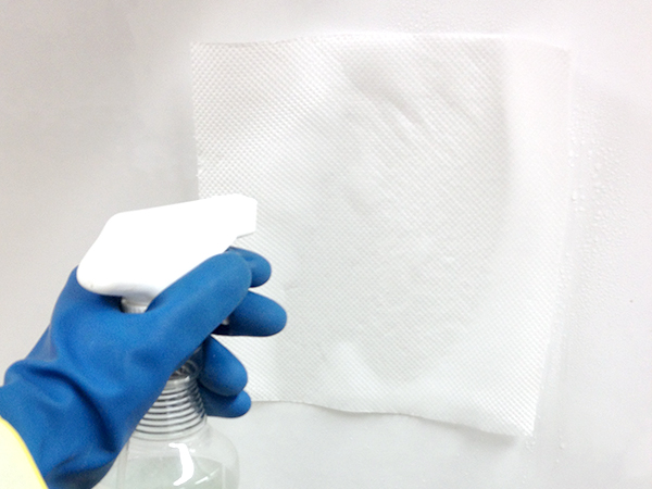- 床と壁全体にキッチンペーパーを当てて、重層水をスプレーします。