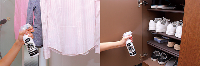 靴の嫌なニオイは、特に実感していただきやすいです。靴の中に除菌消臭スプレーをかけて、軽く乾かしてから嗅ぐと、「ニオイが無くなった!」と驚く方が多いです。