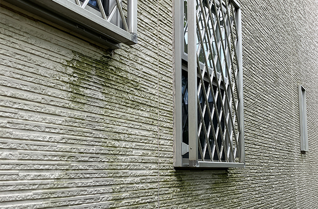 建物の東や北側は直射日光が当たりにくいため、湿気がたまりやすい環境になります。そして、湿度が高い状態が続くとカビやコケ、藻が発生しやすくなり、緑や黒っぽい汚れとして目立つようになるのです。