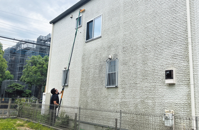 高圧洗浄機を使用しない手洗い洗浄なので、外壁の塗装を傷める心配がありません。プロのスタッフが作業前に塗装の状況を確認した上で、適切な道具と洗剤を使用し、外壁に優しい方法で汚れをしっかりと落とします。