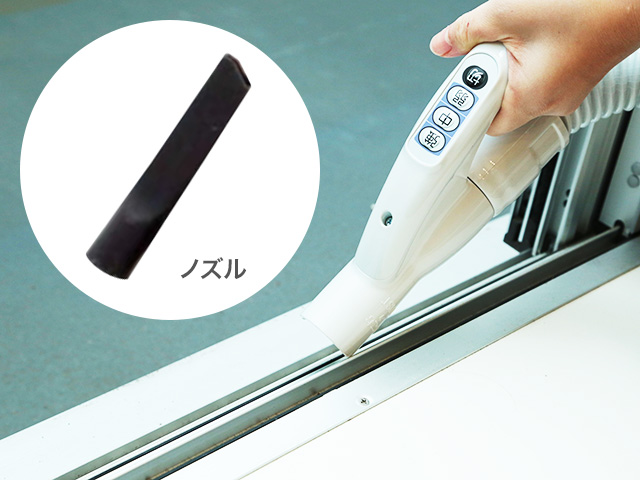 サッシブラシで取り切れなかった砂埃は、掃除機で吸い取ります。隙間掃除用のノズルがある場合は、先端に取り付けて掃除機をかけると、吸い取りやすくなります。