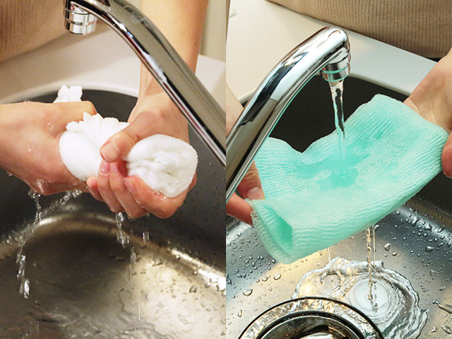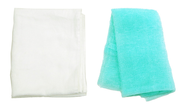 タオル、ナイロンタオルを水で濡らして固く絞り、キレイに畳みます。