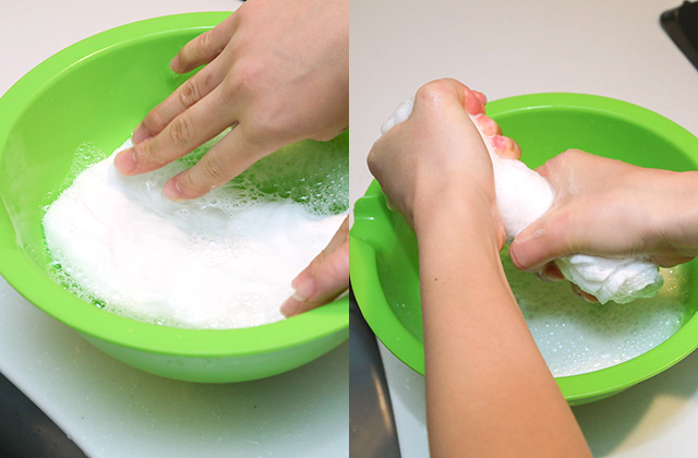 ボウルに水を入れて、食器用中性洗剤を注ぎます。大さじ1杯が目安です。