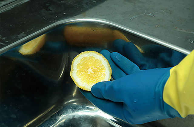 レモンの果肉を使い、シンク全体をまんべんなく擦ります。