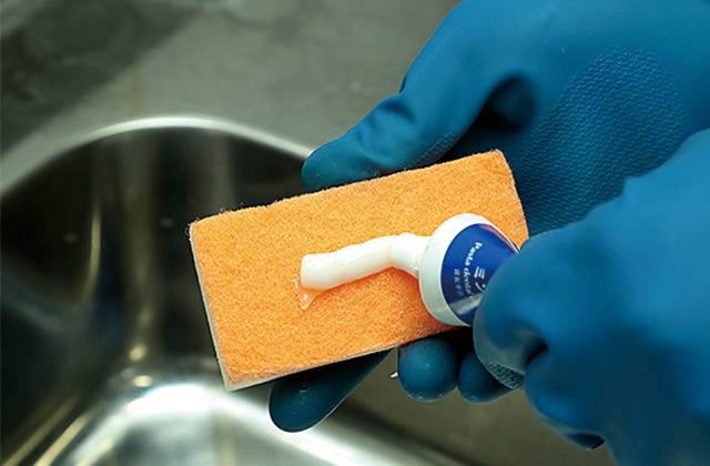 食器洗い用スポンジの硬い面に、歯磨き粉を付けます。