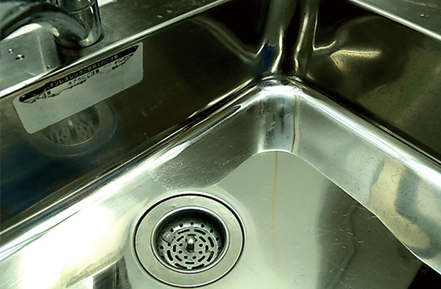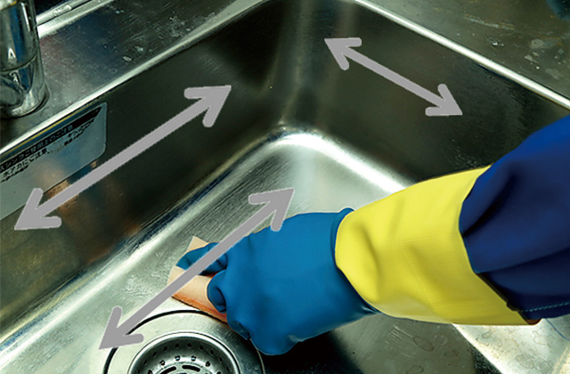 ぐるぐると円を描いてシンクを磨いていませんか?シンクには「ヘアライン」と呼ばれる「目の向き」があります。この向きに逆らって擦るとキズが目立ってしまうため、写真の矢印の方向にあわせて擦ってください。