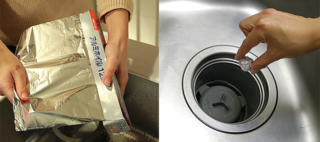 キッチンの排水口は、アルミホイルを小さく丸めて2~3個入れておくだけでヌメリやニオイの防止になります。