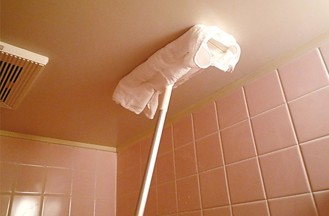 フロアワイパーの先に雑巾を付けて天井を一拭きするだけ。天井のカビは壁や床と違って根を張っていないものがほとんどなので、軽く擦るだけで簡単に取ることができます。
