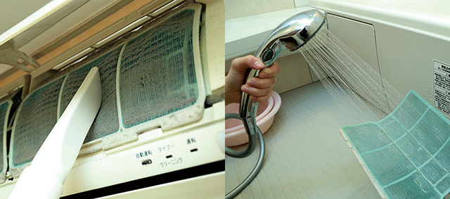 フィルターを外す前にまずは掃除機で表面に付着しているホコリを吸い取ってください。その後、フィルターを外してシャワーで水洗いをします。シャワーを当てる時にはフィルターの裏側から当てるようにします。表側からシャワーを当てると目詰まりをおこしてしまうので注意してください。洗った後は陰干しをして完全に乾かしてから元の位置に取り付けます。