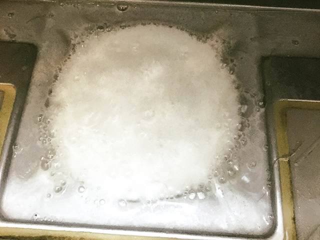 ③さらにコップ1杯程度のお湯をゆっくりと注ぎます。発泡が始まるので、そのまま約5分間放置してください。放置しているあいだに泡の力で排水口に付着した汚れが浮き上がってきます。発泡の際に出るガスは無害なので、安心してください。