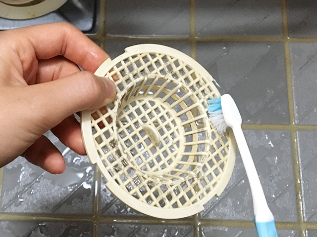 ③排水口とパーツに洗剤を吹きかけ、歯ブラシやスポンジでこすり洗いをします。