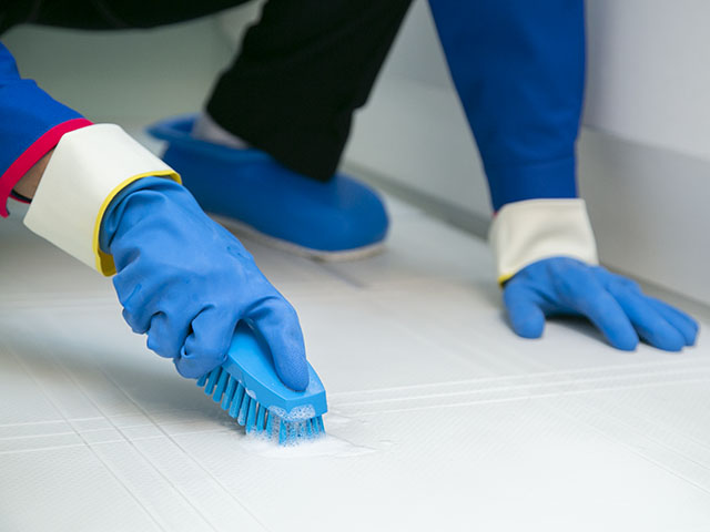 ④放置時間が過ぎたら、シャワーで流しながら歯ブラシやスポンジでこすり洗いをします。