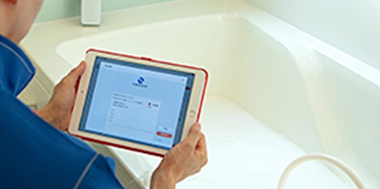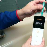 すすぎが終わり、浴槽をスポンジなどでキレイにした後は、再度循環口を綿棒で拭き取り、ルミテスターで汚れや菌の値を計測します。