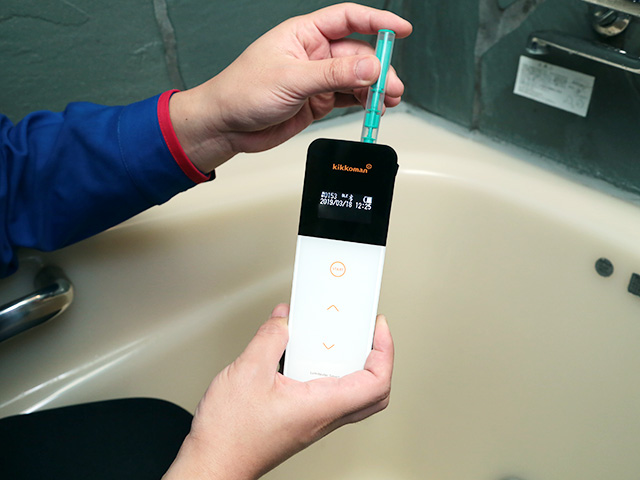 追い焚きのボタンを押すと、出てくるお湯は一見、キレイなように見えます。しかし、このお湯の吸い込み口とお湯が出てくる口を、汚れや菌を測る検査キット「ルミテスター」で計測してみると、なんと!