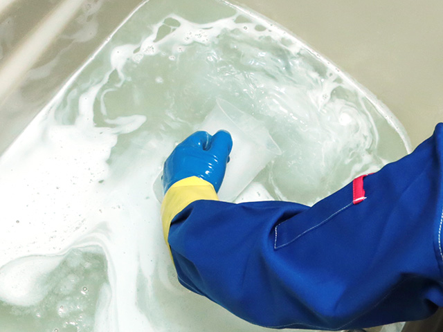 配管内の汚れは、主に油やたんぱく質とそれをエサにして繁殖する様々な雑菌です。おそうじ本舗は、配管内の汚れや菌に特化した有効成分を配合した洗浄剤と除菌剤を理化学研究所と共同開発し、サービスで使用しています。