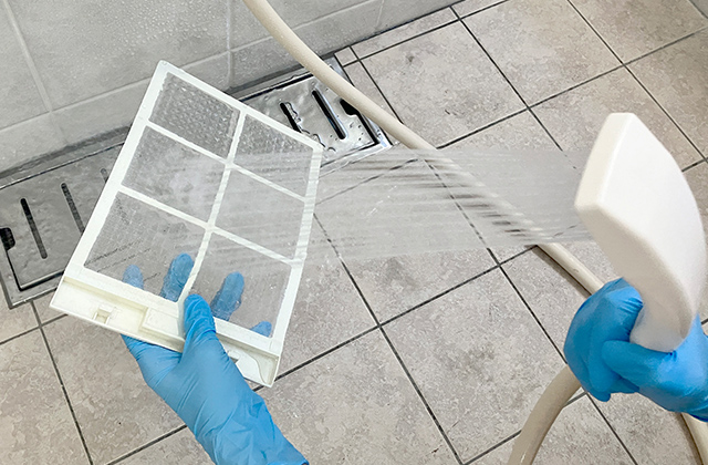ほとんどの場合、浴室乾燥機のフィルターは空気を下から吸っているので、ホコリや汚れはフィルターの下側に付着しています。ホコリが落ちないようにゆっくりと外し、お風呂場の排水口付近で上側から勢いよくシャワーをあててホコリを流し取りましょう。