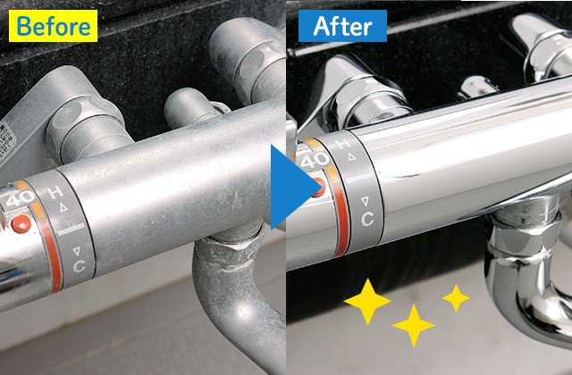 - 蛇口などの水栓金具も細かな部分まで丁寧に洗浄します。鏡についた水アカ汚れもしっかり除去。