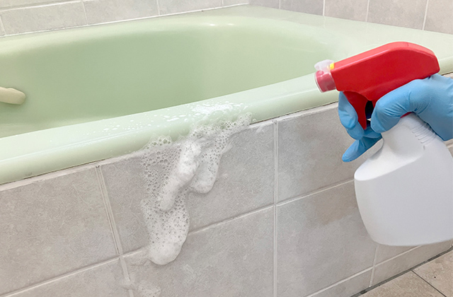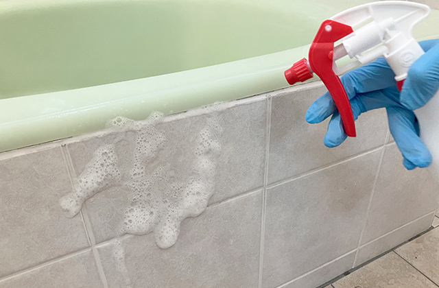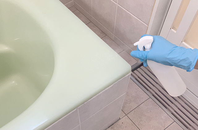 ②ゴム手袋を着用してから、カビが生えている箇所に浴室用洗剤をスプレーします。