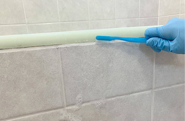 ③ブラシでこすり洗いをして、カビ以外の汚れを取り除きます。