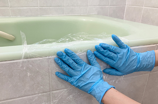 ⑥カビ取り剤の乾燥を防ぐためにラップで覆ってパックします。カビ取り剤の説明書に従い、10〜15分ほどつけ置きします。