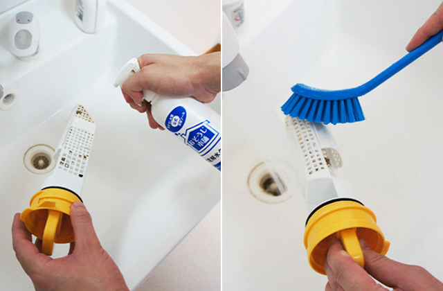 ③排水口の目皿(網状のフタ)や排水トラップ(筒状の部品)などの部品を取り外し、浴室用洗剤とブラシを使って洗います。