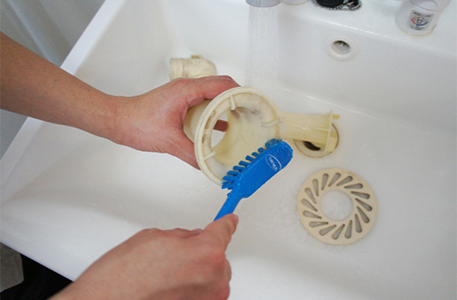 ④排水口の縁や中についたゴミを取り除き、ブラシで磨きます。