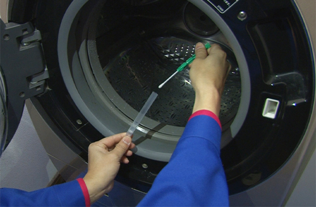 通常は見えない箇所なので、掃除してもキレイになったのか分かりにくいですが、おそうじ本舗では、洗濯機クリーニングの前後にルミテスターという検査キットを使用して洗濯槽の汚れを数値で測定するので、洗浄効果が一目で分かります。
