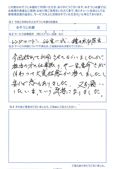 おそうじ本舗スタッフの方々に感謝!! 他の人にも勧めたい!! 店長をはじめ、どの方もプロの仕事をしてくださいました。また、技術・時間だけでなく、接客応対が丁寧で、最後まで気持よくサービスを受けることができました!!