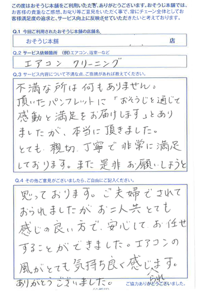 ご夫婦でされておられましたがお二人共とても感じの良い方で、安心してお任せする事が出来ました。エアコンの風がとても気持ちよく感じられます。ありがとうございました。