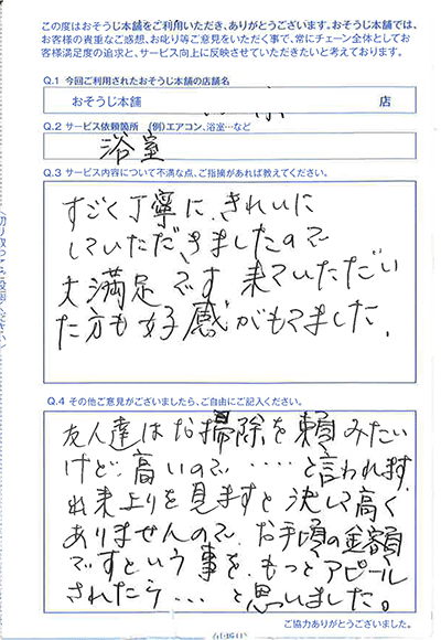 友人達はお掃除を頼みたいけど高いので…と言われます。出来上がりを見ますと決して高くありありませんので、お手頃の金額ですという事をもっとアピールされたら…と思いました。