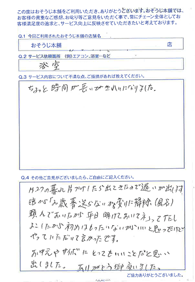 H27の暮れに片づけしたら出てきたので遅いが出します。娘から「お歳暮送らないから変わりに掃除(風呂)頼んでおいたから「平日明けておいてネ」とTELよこしたから始めはもったいないからいいと思ったけどやっていただいて良かったです。 お中元やセイボにとってもいいことだと思い、出しました。ありがとう御座いました。