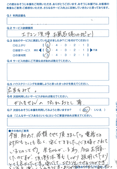 今回初めて依頼させて頂きました。電話での対応もとっても良く安心できました。(ご夫婦でされているとのことで)赤ちゃんがいる為、今回お願いしたのですが、洗浄方法などもしっかり説明して下さりとても良かったです。安心してエアコンもつけることができ入浴も楽しく入れそうです。ありがとうございました。