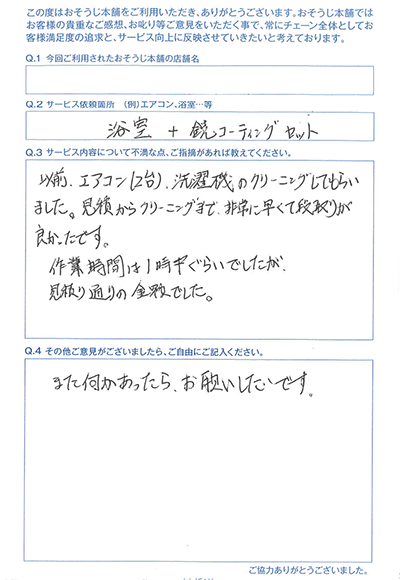 すごく丁寧で、ふだんのそうじ方法なども細やかにしてくれました。養生や気付かいなどもとても良く大満足です。またお願いしたいと思います。