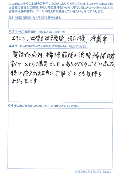 知らない人を長時間一人の家に入れるので以前、利用した人の口コミから安心してお願いしました。仕事もテキパキとアットホームな雰囲気で仕あがりも大満足でした。また、お願いしたいです。