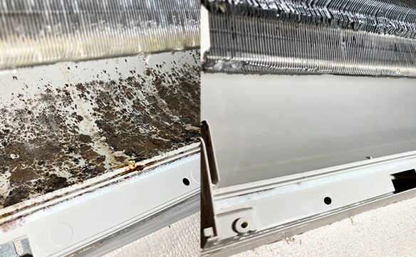 冷房運転はお部屋の熱い空気を吸い込んで、アルミフィンの力で急速に冷やしてお部屋に戻しています。そのため、アルミフィンにはお部屋のホコリがたくさん付着しながら結露を繰り返しているため汚れが溜まってしまうんです。汚れがたまると、部屋に戻す空気が汚れるだけでなく、熱交換効率が悪くなってエアコンに負荷がかかってしまうので、定期的にプロのクリーニングをすることがオススメです!